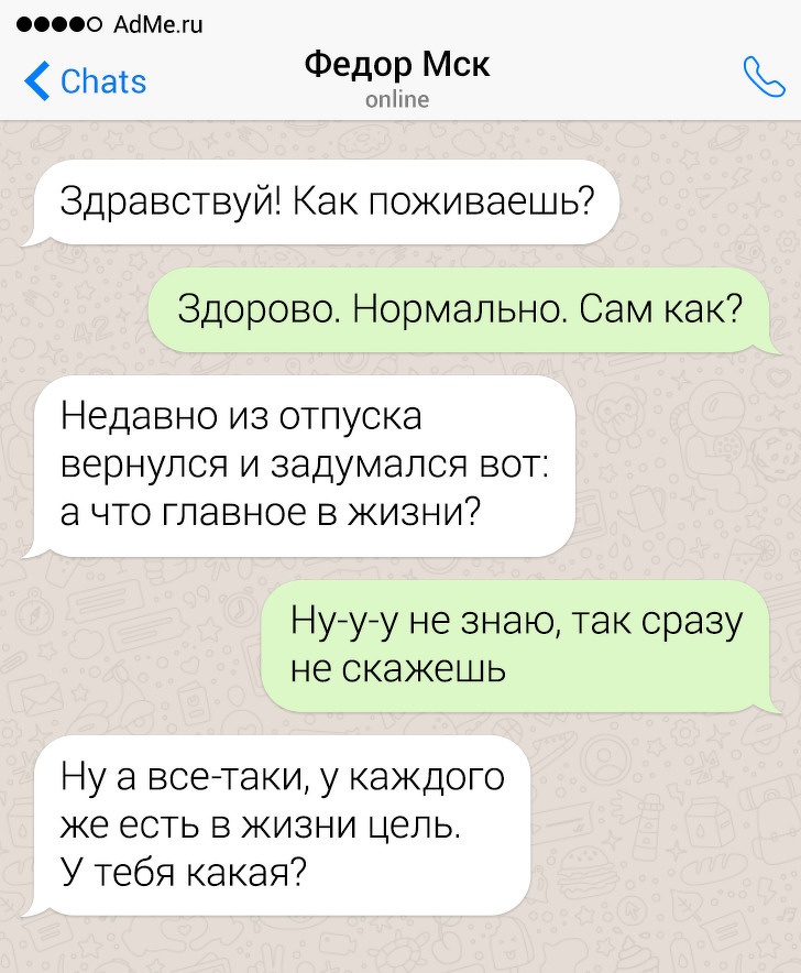 Сенс життя, твори Ніцше та особливості гуманістичної психології — знання цих тем говорить про ерудицію людини. Але це не найкраща тема для щоденних коротких бесід в месенджері, особливо з новим знайомим. Постійні околофилософские теми, питання про політику, релігію і переконання сприймаються як спроби залізти під шкіру або просто нудні.