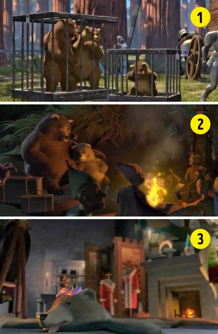 На самому початку мультфільму на ярмарку, де продають казкових істот, ми бачимо замкнених у клітці ведмедів: тата, маму і їхньої дитини. Коли ж вся фольклорна нечисть прийшла на болото до огру, можна помітити, як гірко плачуть ведмідь і ведмежатко. Щоб зрозуміти, куди ж поділася ведмедиця, потрібно всього лише уважно подивитися на картинку вище.