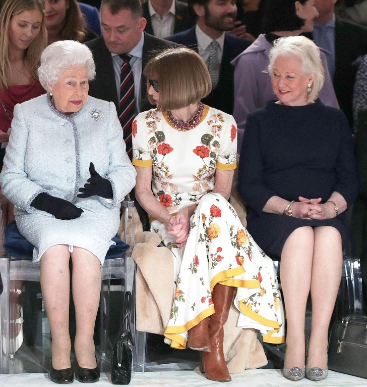 Її Величність Єлизавета II, Ганна Вінтур (головний редактор американського видання журналу Vogue) і Анджела Келлі на показі мод.