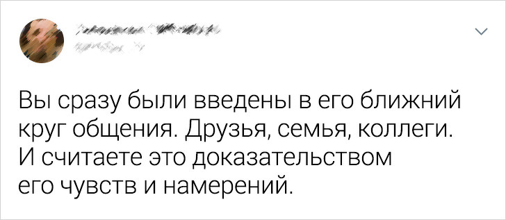 - Опишу свій досвід. Спочатку, так, дуже красиві залицяння. Такі, що, якби я був розумніший (доросліше), я б насторожилася. Я не супермодель і не дочка генерала — звідки такі сонети? І волосся нюхав, і під дверима чекав, про квіти і т. п. навіть не кажу. Дуже любить, надихатися не може. При цьому сам гарний, вихований, заможний — дивно, що такий просто приголомшливий кавалер від такої сірої миші, як я, так балдіє. Але тоді мені так не здавалося, думала, що мені страшенно пощастило. Тут ключове слово «страшно», звичайно. Але під гормонами щастя від божевільної романтики думаєш: «Ах, він так закохався, що навіть ревнує». © Гість