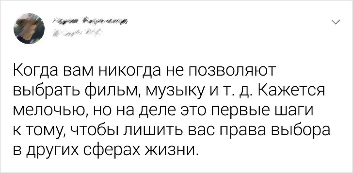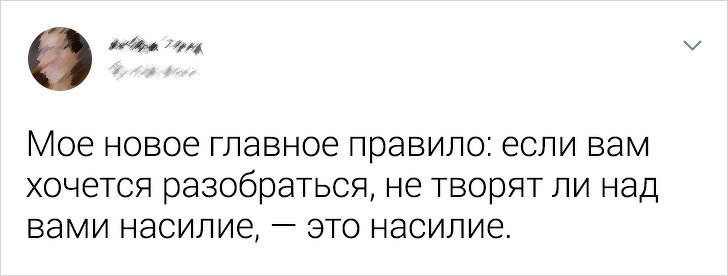 - Моя мама пізно повертається з роботи, і батько її забирає. Кожен раз вона виходить пізно і доводиться її чекати. Кожен раз він закочує з цього приводу істерику, повністю перевертаючи ситуацію: він герой, раз піднявся з дивана, а невдячна мама ще й сміє спізнюватися. Коли партнер виставляє звичайні дії (готування, прибирання тощо) як щось особливе, якщо їх робить він, — це абьюз. Моя мама зазвичай відповідає, що «він же чоловік», але на питання, чи дає відросток йому право вести себе так, відповісти поки що не змогла. © Teacat_w