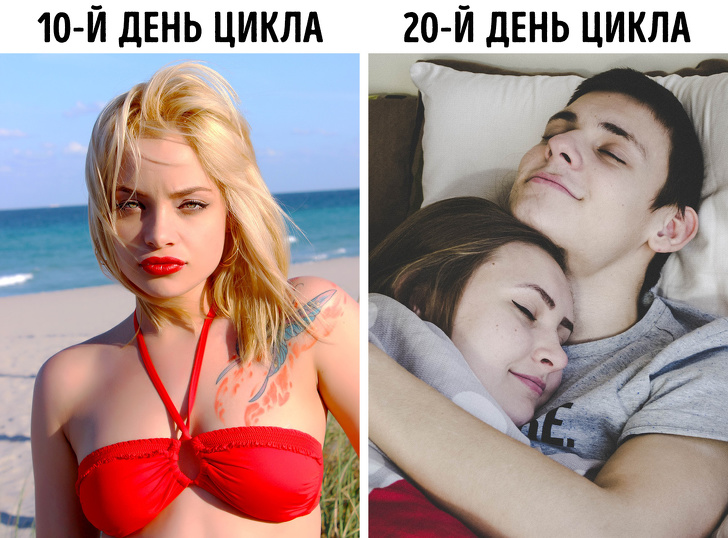 Наприклад, жінки часто відчувають себе більш розкутими приблизно через 10 днів після початку циклу і безпосередньо перед овуляцією. У ці дні вони намагаються одягатися сексуальніше, щоб виглядати привабливішою для потенційних партнерів. Через тиждень, коли підвищується рівень прогестерону, жінки, як правило, більше схильні залишатися вдома з чашкою гарячого чаю і обніматися в ліжку зі своїм коханим.