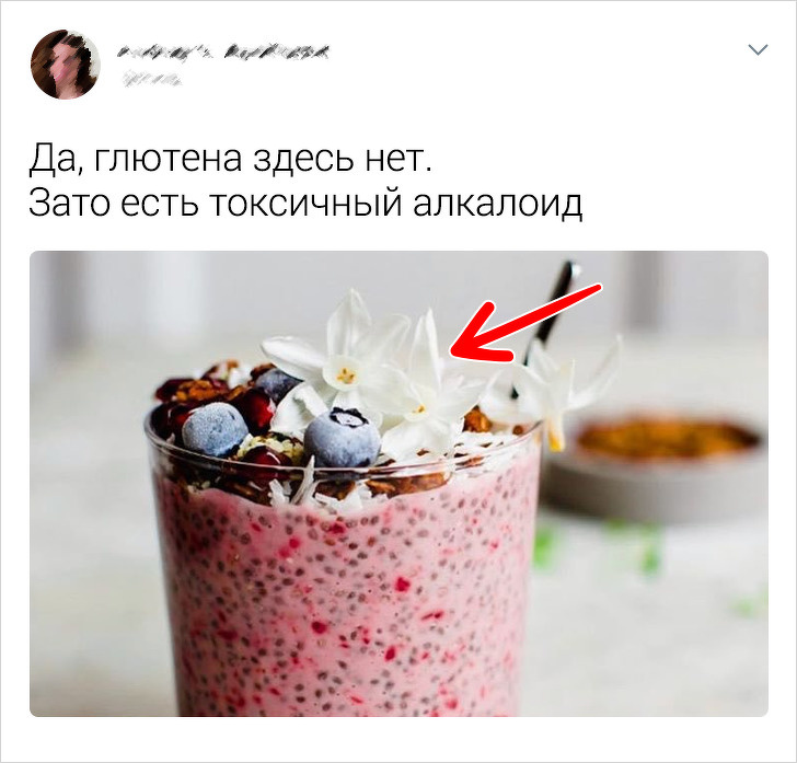 Британський вчений Джеймс Ванг нагадав, що в популярному квітці для прикраси смузі, який використовує кожен другий поборник ЗСЖ, міститься токсична речовина лікорін. Цей токсин розчиняється у воді, тому гіпотетично може потрапити і в напій. З симптомів отруєння: нудота, свербіж і набряки.