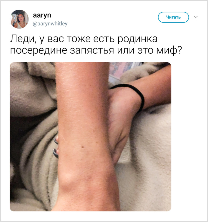 Користувачі твіттера знайшли дивний збіг: у багатьох дівчат з усього світу є однакові родимки в центрі зап'ястя. У мережі бурхливо обговорюють цю загадку, а тисячі дівчат її підтверджують, ділячись фотографіями своїх рук.