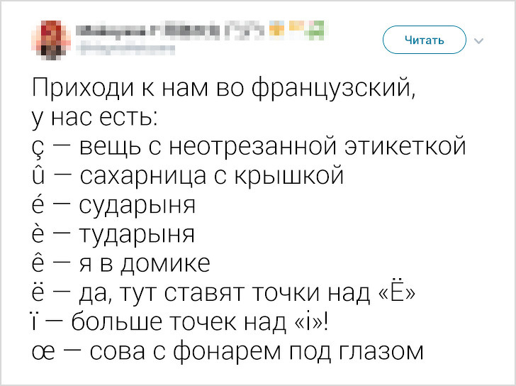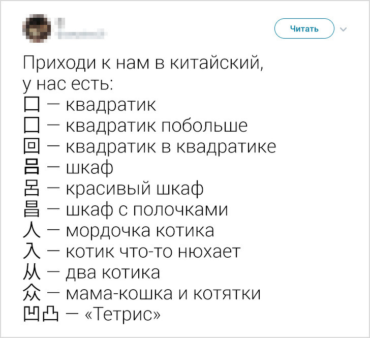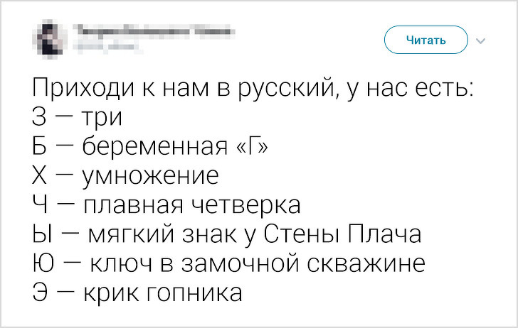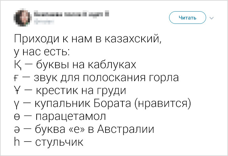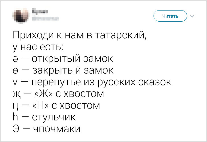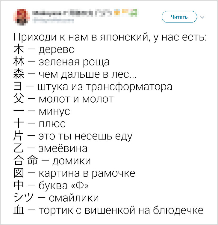 В кінці травня в твіттері виник флешмоб, який був присвячений різним мовам. І зокрема буквах, обриси яких у представників іншої мовної культури асоціюється з чим завгодно, тільки не з літерами. Наприклад, слово «фігура» у японській писемності позначається ієрогліфом, який більше схожий на малюнок в рамці.