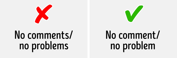 При вживанні таких слів ми використовуємо тільки однину. Незважаючи на те, що в російських варіантах воно множинне: «без коментарів», «без проблем».