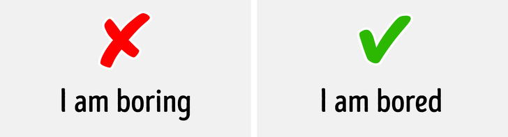 Boring — це «нудний»; «той, який змушує нудьгувати», а bored — це «нудьгуючий»; «той, хто відчуває нудьгу». Наприклад: