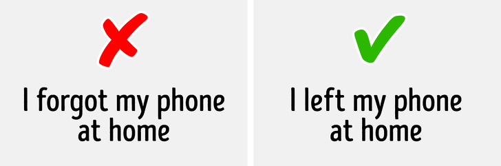 Forget / forgot — значить «забути» в сенсі «не пам'ятати якусь інформацію»: дати, числа, події, людей. А Leave / left в даному випадку означає «залишити якусь річ де-небудь».