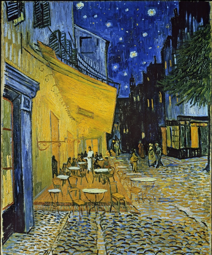 «Нічна тераса кафе» написана художником без використання чорної фарби. Цей факт здається неймовірним. Ніч Ван Гога різнобарвна, джерелом світла служить ліхтар, який забарвлює терасу кафе. Вінсент дуже любив жовтий колір і зоряне небо, в цій картині він з'єднав ці дві пристрасті. А вільні столики так і манять зайти в це кафе. Картина знаходиться в Нідерландах в Музеї Креллер-Мюллер.