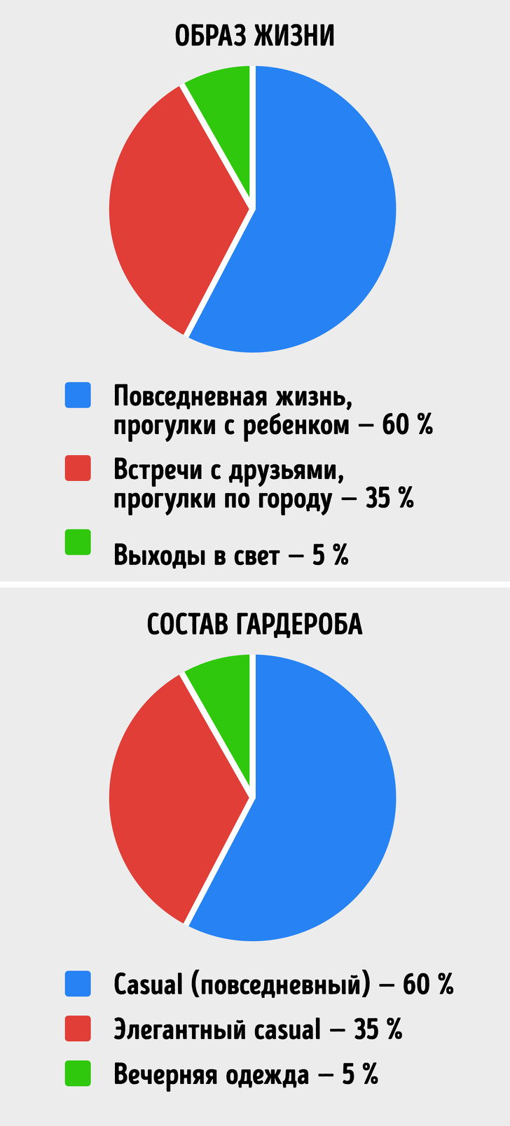 - Крок № 1: Аналіз вашого способу життя. Візьміть аркуш паперу і напишіть, для яких життєвих ситуацій вам потрібні образи, а навпаки вкажіть відсоток того, скільки часу ця сфера діяльності займає відносно всіх інших сфер життя. Виглядати це може, наприклад, так: робота в офісі — 60 %, прогулянки з дітьми — 20 %, виїзди на природу — 15 %, вечірні виходи в світ — 5 %. Зрозуміло, що в такому випадку левова частка гардеробу повинна складатися з нарядів для офісу.