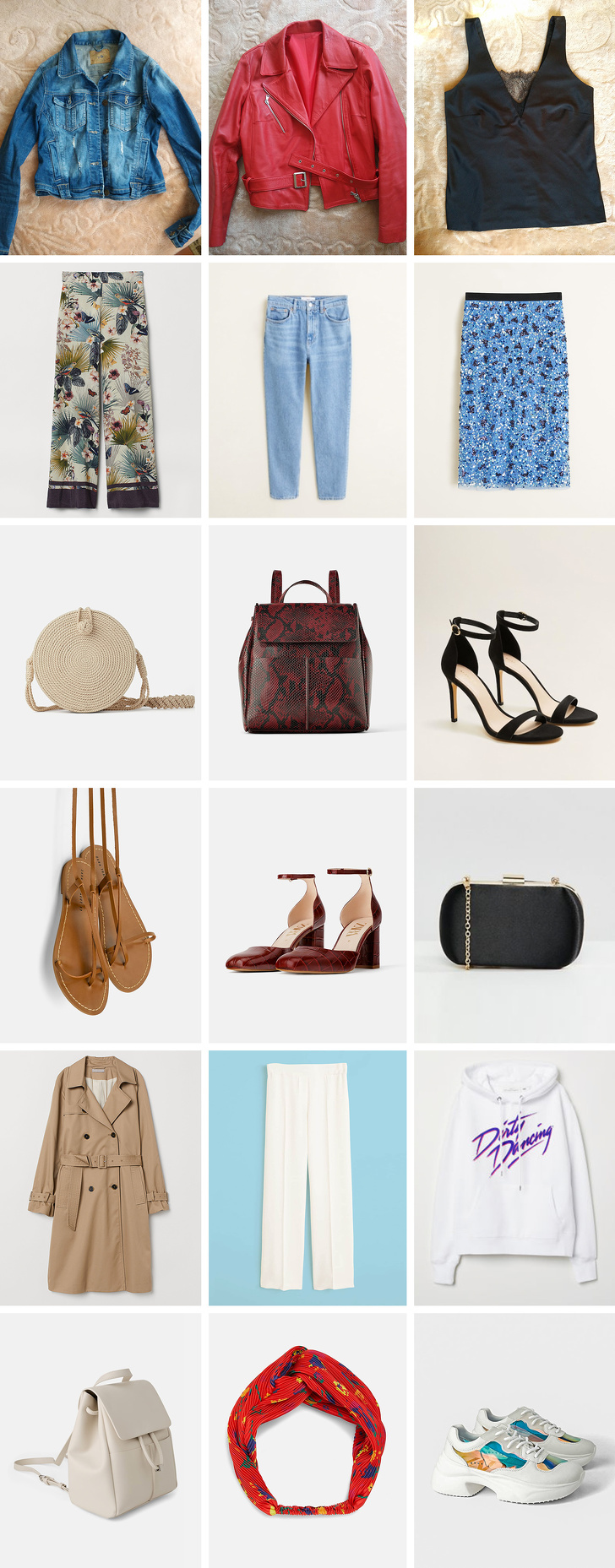 На основі розбору шаф Ніни я склала гардеробну капсулу на весняно-літній період. Як і годиться, в капсульному гардеробі всі речі прекрасно поєднуються один з одним, що дозволяє створювати нескінченну кількість образів. З речей Ніни у цю добірку ввійшли джинсовці, червона шкіряна косуха і базовий чорний топ з мереживом на спині. Всі інші речі — із актуальних колекцій магазинів мас-маркету.