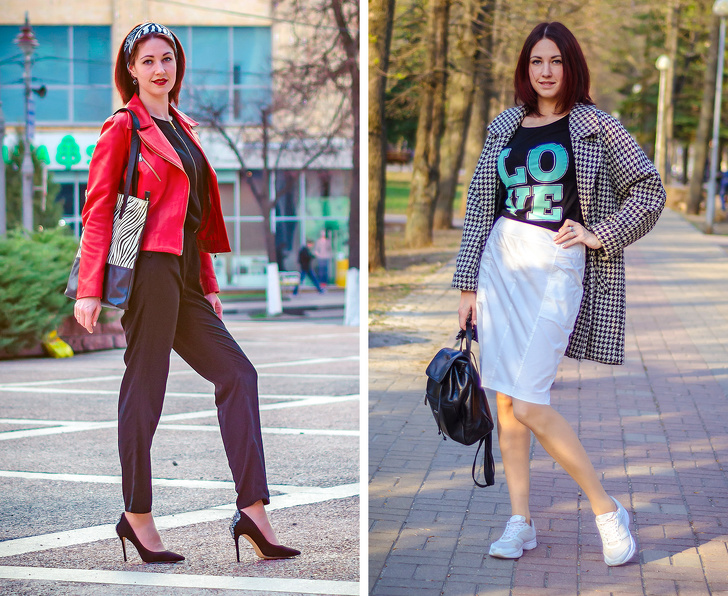 Образ зліва стане повсякденним, якщо поміняти човники, приміром, на черевики-оксфорди або лофери. Образ праворуч, призначений для більш холодного часу року, можна доповнити вовняною спідницею-олівцем у велику клітку, це дозволить утеплитися і створити актуальну гру принтів. Під пальто, як варіант, надіти водолазку, а на ноги — чоботи або грубі черевики в байкерському стилі на тракторній підошві. Або ж віддати перевагу витонченим ботильонам на підборах.