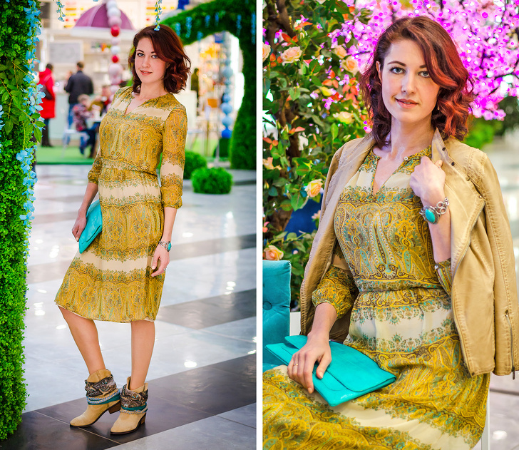 Я запропонувала зробити образ за мотивами бохо-стиль: «подружити» шифонове плаття з бежевими черевиками, декорованими хусткою і шнурками, доповнити наряд бірюзовим клатчем і срібним браслетом з бірюзою, а на плечі накинути шкіряну бежеву куртку, бо ще досить прохолодно.