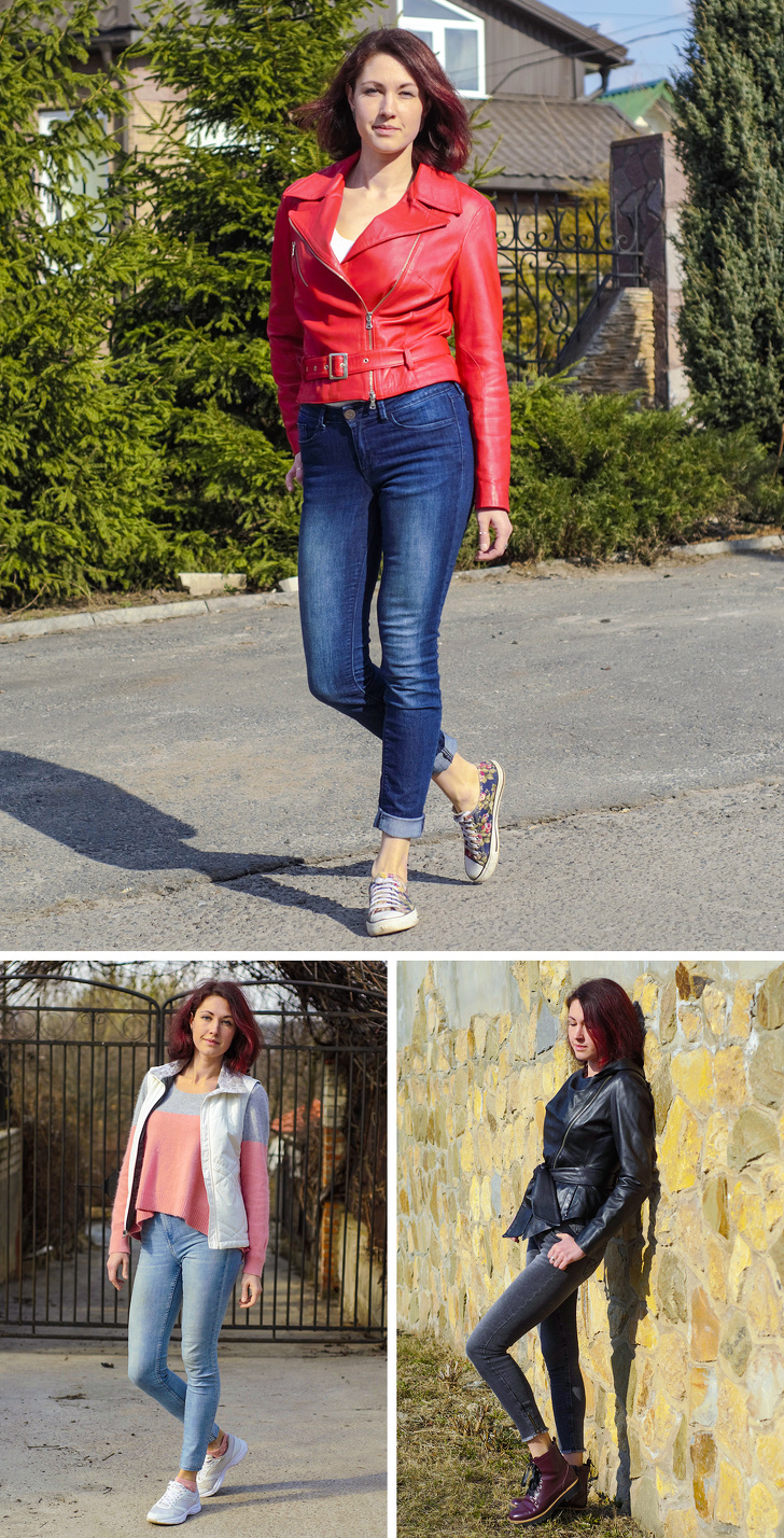 Ніна поділилася тим, як вона виглядає в своєму повсякденному житті. Червона косуха з синіми джинсами — звичайний вид для зустрічей з друзями, блакитні джинси з рожевою кофтою — для прогулянок з дитиною по магазинах, чорна куртка з сірими джинсами — для міських прогулянок.