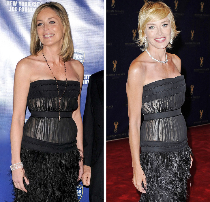 Кожен вихід Шерон Стоун на червону килимову доріжку можна вважати міні-показом мод. Актриса завжди вибирає для появи на публіці роботи іменитих дизайнерів. У сукні від Roberto Cavalli Шерон була помічена двічі: у 2009-му на вечірці Mardan Palace в турецькій Антальї і через рік на концерті в честь Фонду поліції Нью-Йорка. В обох випадках Стоун використовувала гру на контрастах, поєднуючи світлі і темні аксесуари.