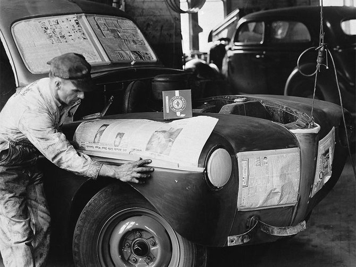 Тут варто зробити відступ. У ті роки було популярно фарбування автомобілів в 2 кольори. Але для автомалярів процес фарбування був тяжким: вони використовували саморобний клей, газети, хірургічну стрічку. Остання при знятті часто відривався разом зі свіжою фарбою. Доводилося все робити заново. Тоді-то і використовувалася наждачний папір.