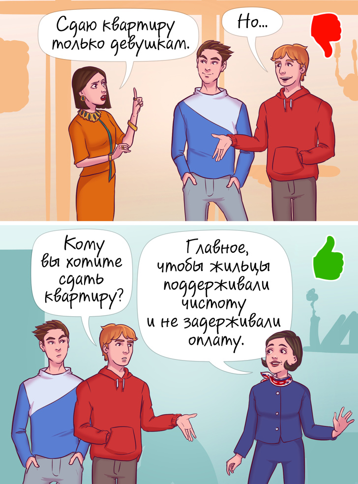 Часто при пошуку квартири можна зіткнутися з такими обмеженнями: «Здаю кімнату студенткам». Але статева приналежність нічого не говорить про те, як людина буде ставитися до орендованої житлової площі. Щоб якось нівелювати таке ставлення господарів, можна або свідомо ігнорувати подібні оголошення особистим прикладом доводити господарям, що їх позиція є помилковою, — при спілкуванні і в процесі проживання.