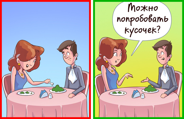 - Тому ніколи не варто брати чужу ручку без дозволу або лізти виделкою в тарілку іншої людини, щоб спробувати якусь страву, навіть якщо це ваш родич або друг. Це може зачепити людину, але він промовчить, хоча дискомфорт залишиться. Так що краще запитайте зайвий раз, чи можна взяти той ласий шматочок, який на вас так і дивиться.