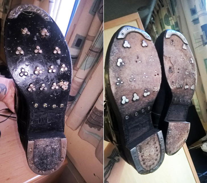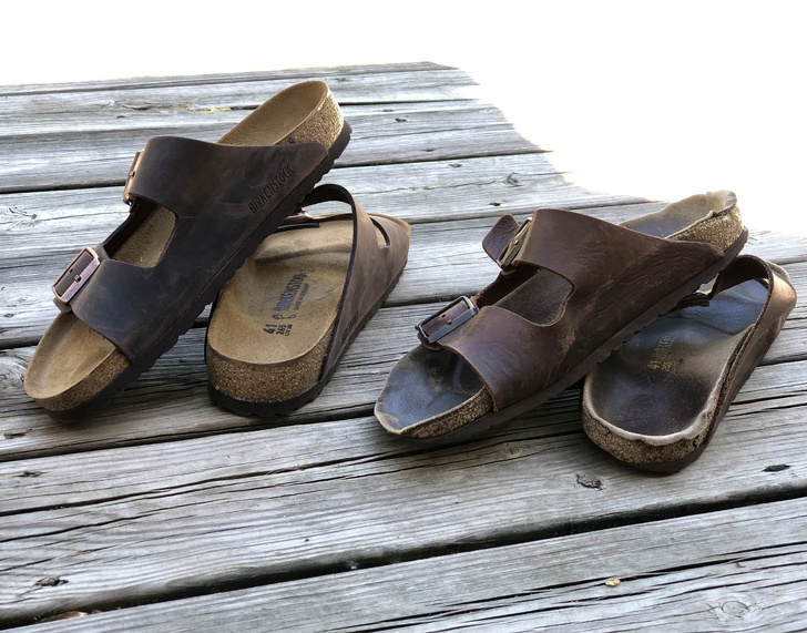 14. Обидві пари взуття були куплені 17 років тому. Тапочки зліва не носили ні дня