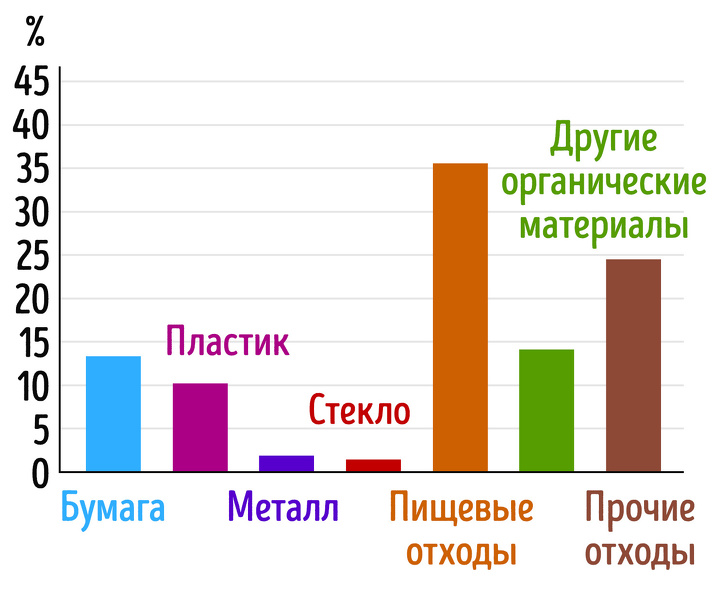 Ще однією серйозною проблемою сучасності називають харчові відходи. Ми вже звикли закуповувати продукти повними візками. Частина з них так і не з'їдається: овочі можуть запліснявіти, молоко — прокиснуть, а якісь умовні сосиски просто виявляться несмачними і відразу ж полетять у відро для сміття.