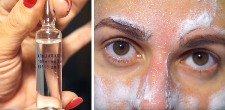 - Знадобляться: ампула хлориду кальцію (для початку краще взяти концентрацію 5 %, далі можна збільшити до 10 %), туалетне мило без запаху, ватяні диски і жирний крем. Вміст ампули шарами наноситься на обличчя. Поверх висохлого першого шару — другий і т. д. Коли рідину з ампули повністю нанесена, потрібно рясно намилити особа. Лужна мильна піна вступає в хімічну реакцію з хлоридом кальцію, в результаті чого утворюються білі лусочки, які видаляють ороговілий шар шкіри. Пілінг необхідно завершити будь заспокійливої маскою і нанести жирний крем.
