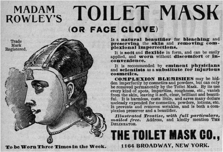 У XIX столітті жінки, як і зараз, в гонитві за молодістю і красою були готові на багато чого — навіть всю ніч спати в гумовій масці. Її винахідниця Хелен Роулі стверджувала, що маска очищала, отбеливала і омолаживала шкіру. Насправді гума лише стимулювала потовиділення, і який був ефект, ми можемо тільки здогадуватися.