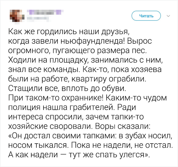 Деякі породи собак, незважаючи на страхітливий вигляд, мають чудовий характер і добру вдачу. У числі таких величезних добряків — ньюфаундленди. Вони абсолютно позбавлені агресії по відношенню до людей, що доводить бонус в кінці статті, і схильні до самостійного прийняття рішень, а тому дуже тямущі і розважливі. Цікавий і той факт, що ці собаки в буквальному сенсі слова виходять сухими з води, тому що їх шерсть зовсім не намокає. А завдяки перетинкам між пальцями ньюф — прекрасний плавець.