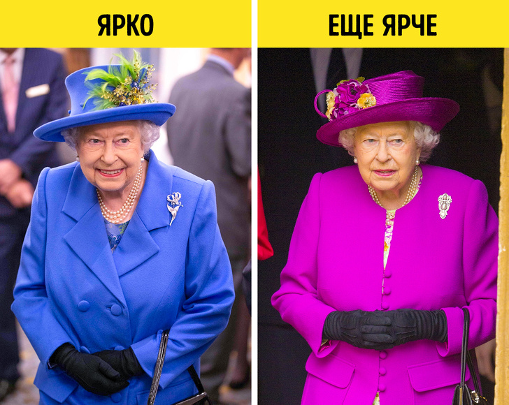 Королева Єлизавета II завжди відрізняється своїми яскравими монохромними нарядами, і справа тут зовсім не в її любові до барвистим квітам. За правилами британської сім'ї, королеву завжди повинно бути видно у натовпі, щоб люди могли спокійно розгледіти її і сказати: «Я бачив королеву!»