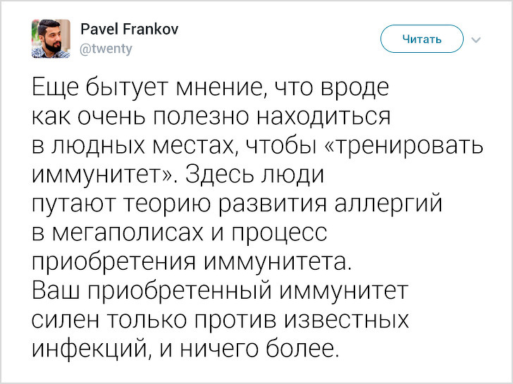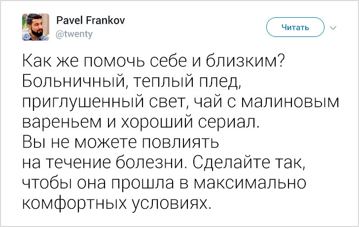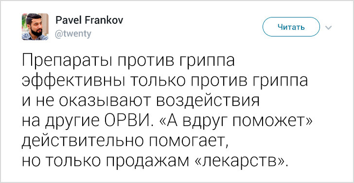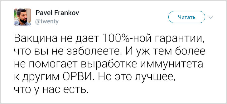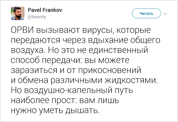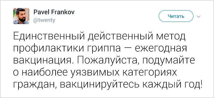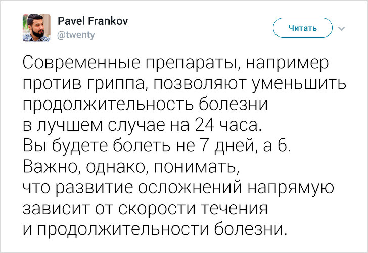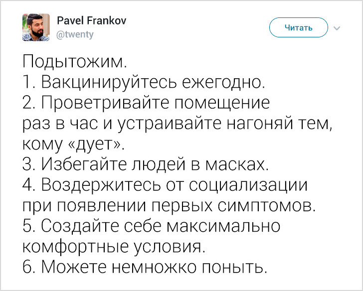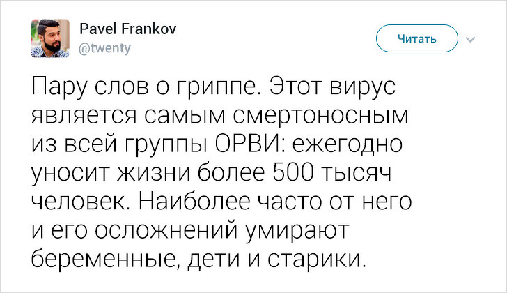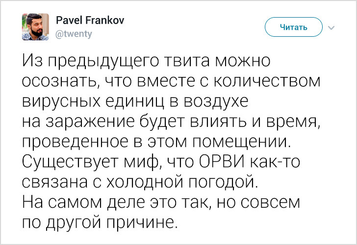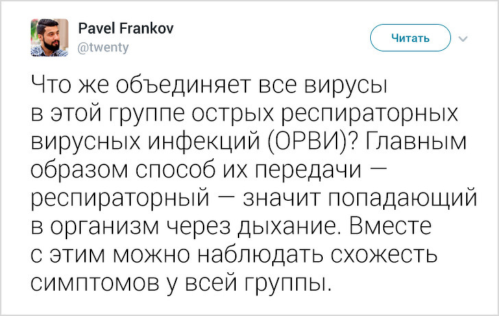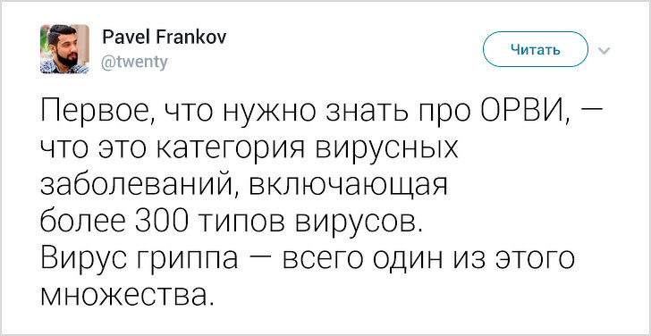 Хтось, вболіваючи ГРВІ, воліє ходити до лікаря і виконувати його рекомендації, інші вибирають просто побути вдома, вкрившись теплим пледом. А ось Павлу Франкову з Санкт-Петербурга так набридло хворіти, що він вирішив розібратися в темі, що стосується цього осінньо-зимового недуги. Допомагали йому в цьому численні родичі-лікарі. Своїми знаннями хлопець поділився в тред в твіттері. Він дав цінні поради про те, як потрібно себе вести, щоб не захворіти, і розповів, чому все-таки варто зробити щеплення від грипу.