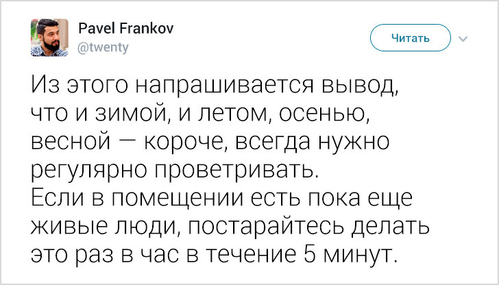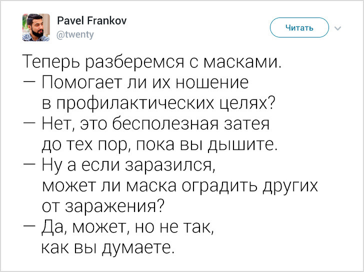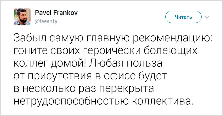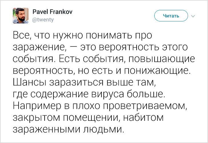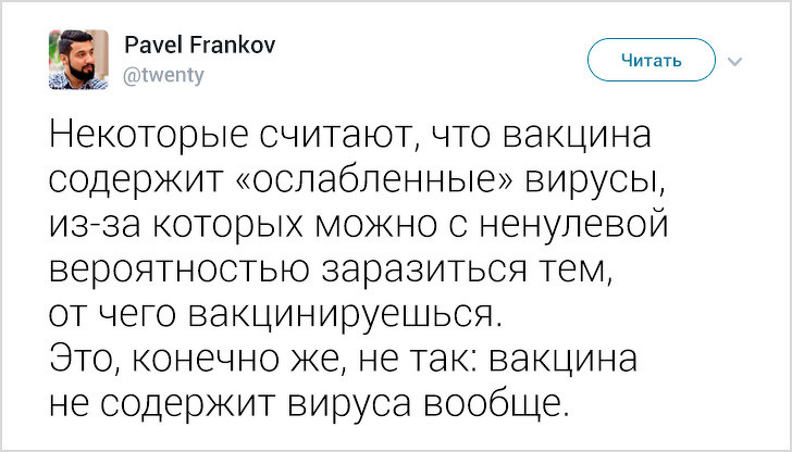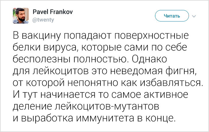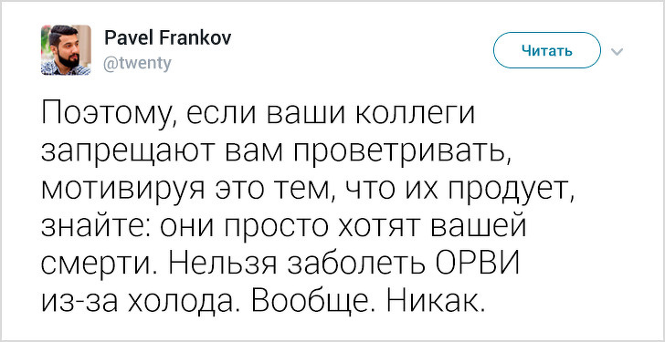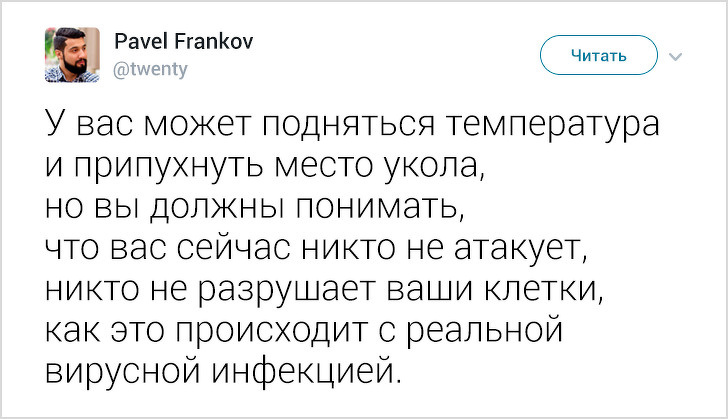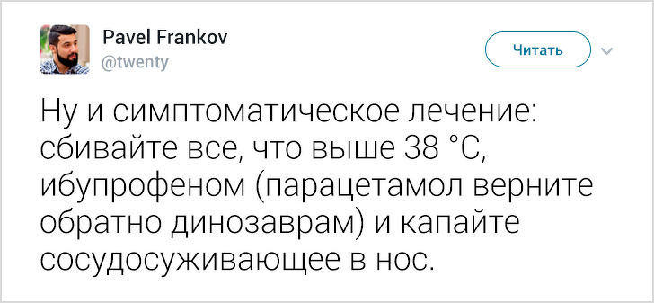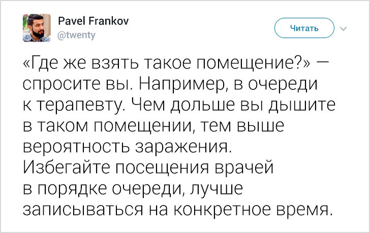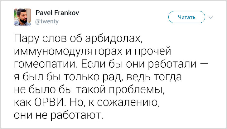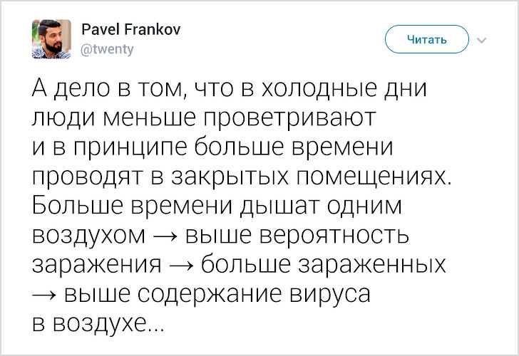 Хтось, вболіваючи ГРВІ, воліє ходити до лікаря і виконувати його рекомендації, інші вибирають просто побути вдома, вкрившись теплим пледом. А ось Павлу Франкову з Санкт-Петербурга так набридло хворіти, що він вирішив розібратися в темі, що стосується цього осінньо-зимового недуги. Допомагали йому в цьому численні родичі-лікарі. Своїми знаннями хлопець поділився в тред в твіттері. Він дав цінні поради про те, як потрібно себе вести, щоб не захворіти, і розповів, чому все-таки варто зробити щеплення від грипу.