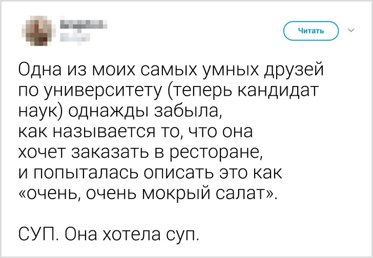 Але Підлога не самотній. Його твіт надихнув тисячі людей поділитися своїми історіями про те, як вони забували потрібний їм слово саме в той момент, коли воно найбільше було необхідно. А редакція Social.org.ua постаралася вибрати з цих історій самі незручні, але в той же час смішні.