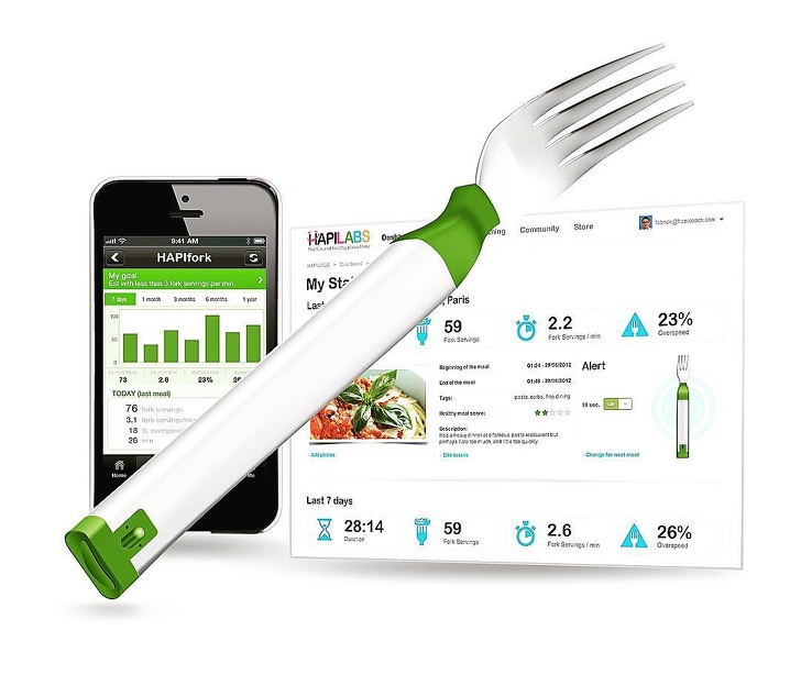 Це пристрій здатний допомогти контролювати або змінювати будь-які звички в їжі. Вміє відстежувати рухи руки, вимірювати час між укусами і скаже вам є повільніше, якщо ви поспішаєте. Це допоможе не переїдати і не набрати зайву вагу. Продають її тут.