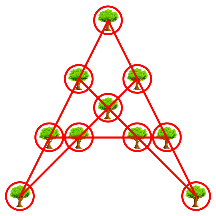 - В саду росло 49 дерев. Вирішивши, що сад заростає, садівник задумав розчистити його. Він найняв дроворуба і дав йому завдання: залишити 5 рядів по 4 дерева в кожному. Коли робота була виконана, садівник прийшов оцінити результат і був засмучений: дроворуб зрубав 39 дерев, залишивши лише 10. «Навіщо ти вирубав майже весь сад? — запитував садівник. — Тебе просили залишити 20 дерев». «Ні, — відповів працівник, — не просили. Ви наказали залишити 5 рядів по 4 дерева в кожному, так я і зробив». Садівник був здивований, але переконався, що з решти 10 дерев утворюються 5 рядів по 4 дерева в кожному. Як дроворуб примудрився це зробити?