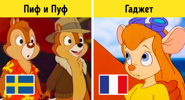 У Франції Чіп і Дейл стали Тиком і Такому, а Гаєчку залишилася Гаджетом. У шведів в групу рятувальників увійшли Піф, Пуф, Парлан (і ні, це не третій порося, а ще одне ім'я Гаєчки), Оскар і Зіпер (саме так насправді звуть милашка Вжик).