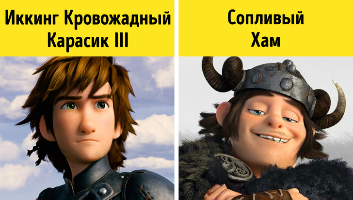 Головного героя мультфільму звуть Hiccup Horrendous Haddock III (hiccup — «гикавка», horrendous — «жахливий», haddock — «окунь»). Вітчизняний дубляж перетворив його в Иккинга Кровожерливого Карасика III. А Сморкалу насправді звуть Snotlout («сопливий хам»).