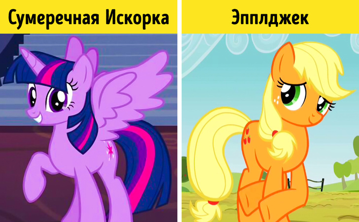 Знамениті поні теж змінилися, коли перетнули мовні кордони. Є підозра, що під час дубляжу перекладачі не прийшли до єдиної думки, як перевести їх імена. В результаті Twilight Sparkle стала Сутінкової Іскорки, Rainbow Dash перевели лише наполовину і назвали її Веселкою Деш, ну а Applejack не змінювали зовсім (вона так і залишилася Эпплджек). Загальне рішення для імен і назв? Не в цьому випадку.