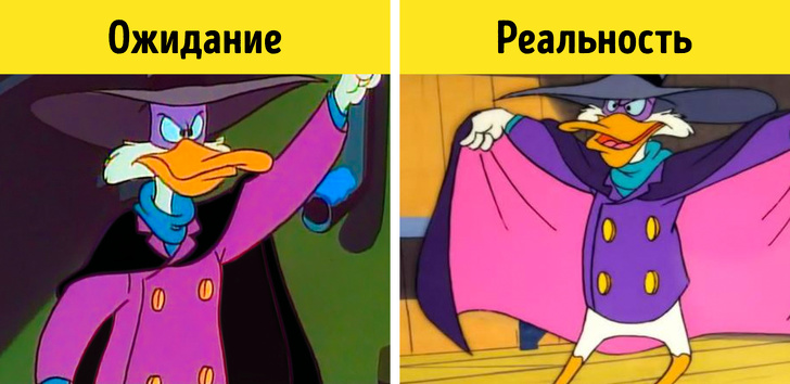 Перш за все дісталося головному герою. Він — Темнокрылая Качка (Darkwing Duck), але для солідності способу став Чорним Плащем. І нікого зовсім не бентежило те, що плащ у нашого героя не чорний, а фіолетовий. До речі, його фірмовий крик «Від гвинта!» на ділі звучав як «Давайте зробимо небезпечно!» (Let's get dangerous!).