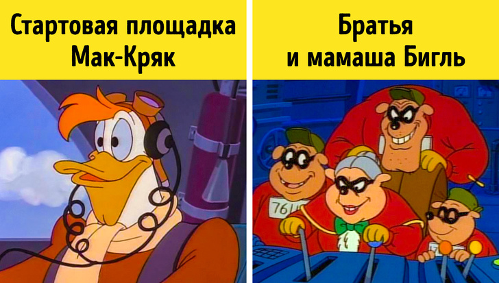 Талановитий льотчик Зигзаг Мак-Кряк насправді носить грізне ім'я Стартовий Майданчик (Launchpad McQuack). Головні лиходії брати Гавс за океаном відомі як The Beagle Boys, і це пряме відсилання до породи собак бігль.