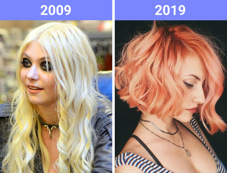 Багато зірок в 2009 році віддали перевагу повного освітлення. Тейлор Момсен, Сієнна Міллер і Кейт Мосс стали ультраблондинками, і їх було чимало прихильниць. В 2019-му віддають перевагу більш природні відтінки. Наприклад, зараз дуже популярні пастельні тони з наборів Pantone. А фіолетові локони, схоже, відходять у минуле.