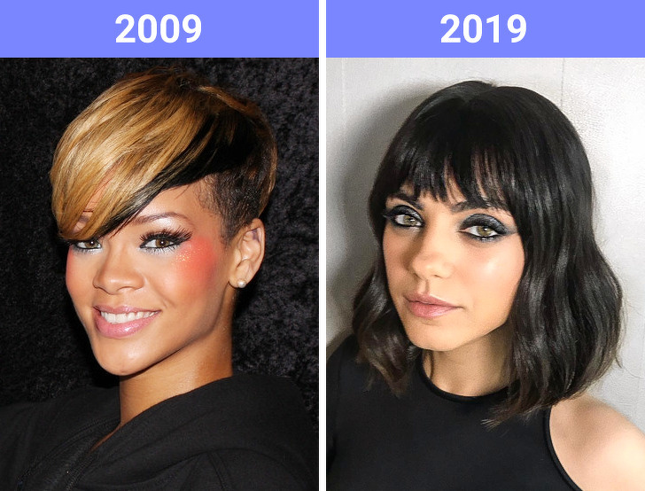 Асиметричні стрижки, такі як пікс і боб, були трендом 2009 року. Ріанна, Вікторія Бекхем, Майлі Сайрус, Кеті Холмс і Періс Хілтон експериментували з різною довжиною волосся близько 10 років тому. Головним хітом 2019 року стає дитяча чубчик, піднесена над бровами, а також чубчик-шторка.