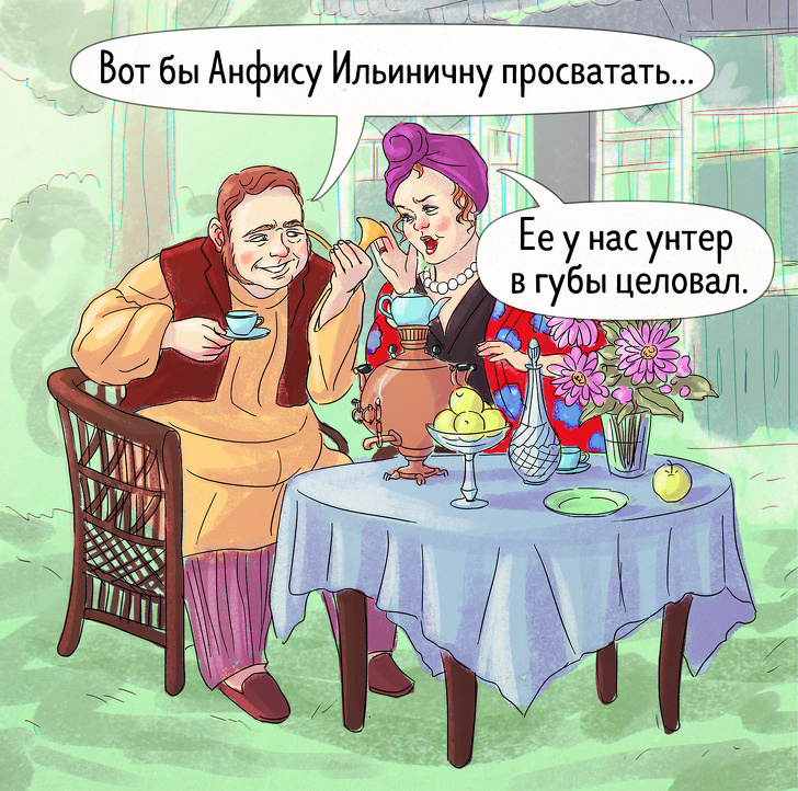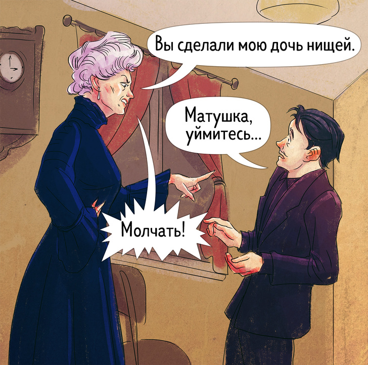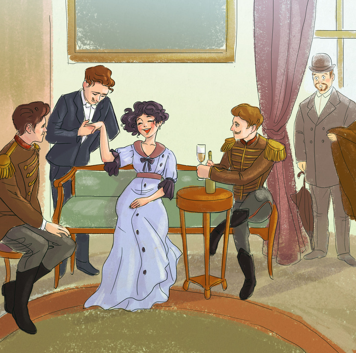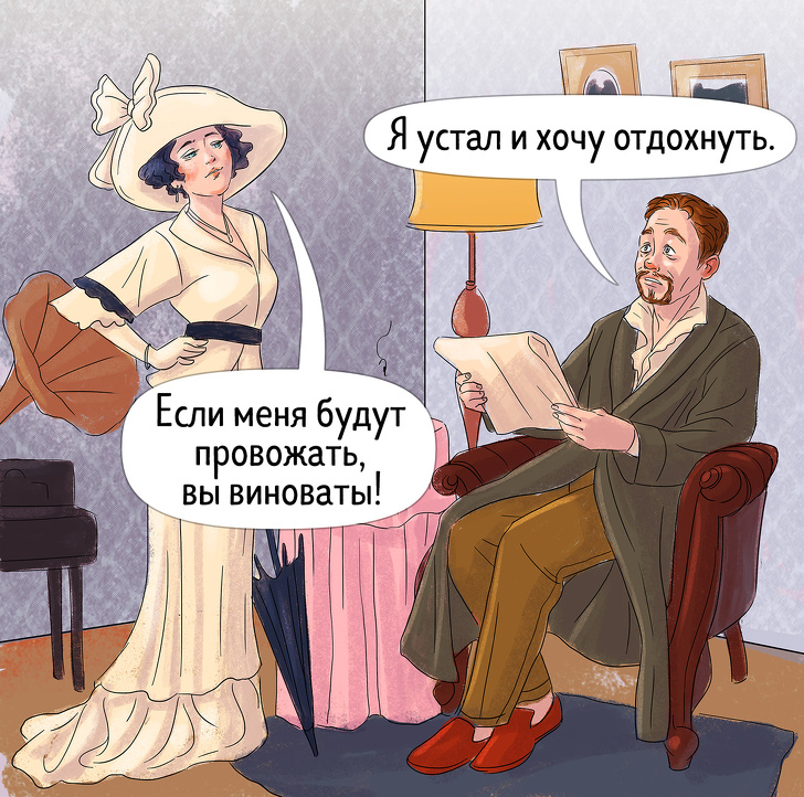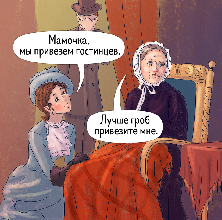- Два хутряних салопа, суконь — скільки є, шиньйон тільки один, щоб дружина не звикала займатися собою. Взуття не брати взагалі. Бо нареченої, щоб зробити ніжку менше, замовляють взуття тісний і для ходьби нікчемну.