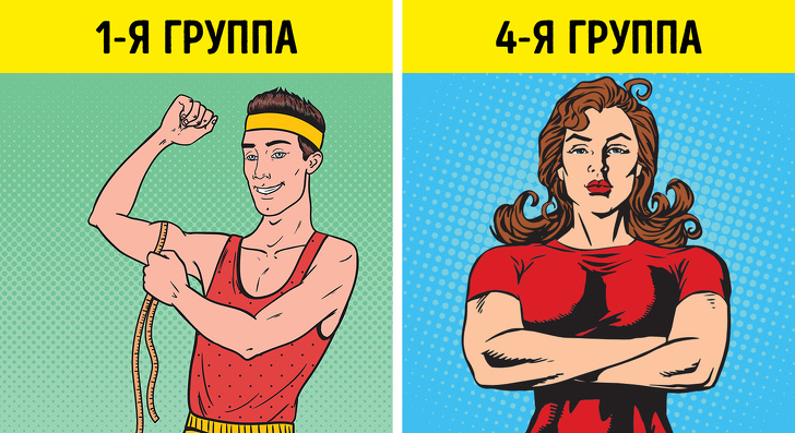 - 4-я група: ці люди вважаються найсильнішими, тому люблять заняття в залі і часто обирають види спорту, пов'язані з підняттям тяжкості. Наприклад, можна спробувати пауерліфтинг і силову атлетику