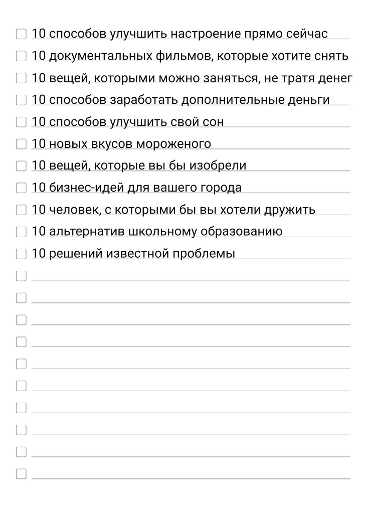 Якщо кожен день записувати по 10 ідей на найрізноманітніші теми, то наприкінці місяця у вас буде вже понад 300 ідей. Можна писати і більше — 15, 20, 100. Записуйте, поки ідеї спалахують у вашій голові, як новорічний салют в нічному небі. Може, ви придумаєте новий бізнес, заведете блог, сплануєте подорож, створите рок-групу, знімете фільм або поміняєте професію. Хто знає, до яких змін це може призвести.