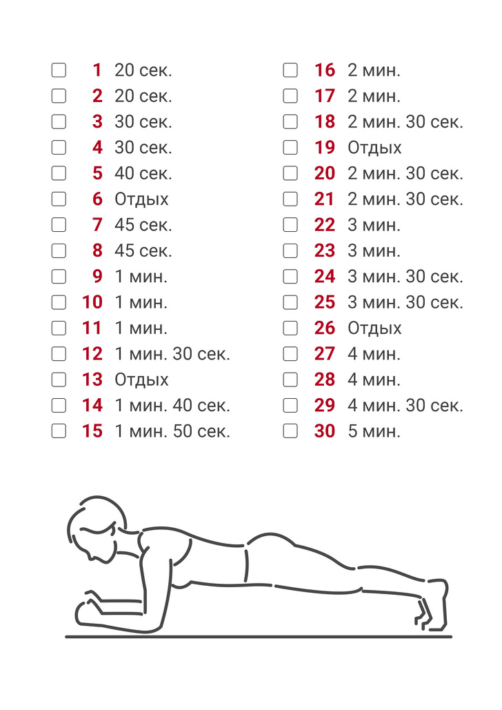 Факт: планка — одне з кращих вправ, що розвивають м'язи кора і допомагають прискорити метаболізм. А з урахуванням того, що планка займає зовсім небагато часу, робити її варто щодня. Ми склали план на 30 днів, який допоможе не заплутатись з часом в планці і розвинути звичку. Хочеться більше? Тоді в наступному місяці зберігайте результат і збільшуйте час по новому колу. Тобто 1-го числа у вас буде 5 хв. 20 сек. в планці.