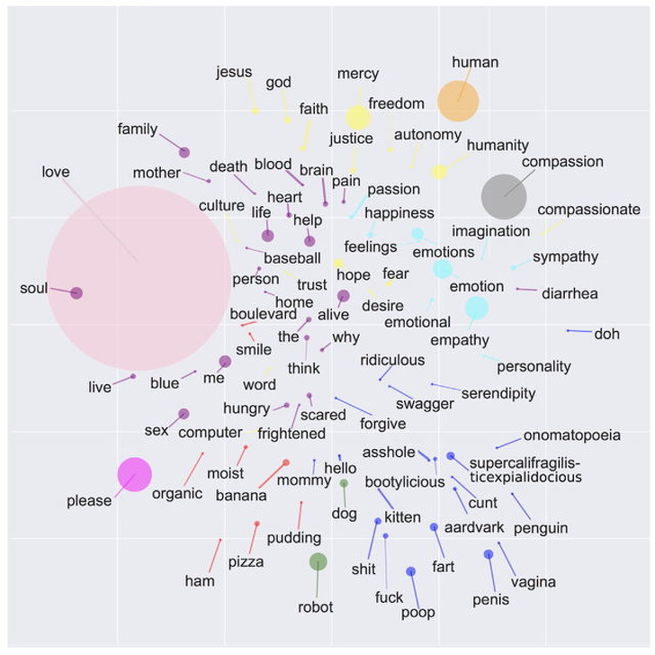 Не менш активно пропонували слова зі зменшувально-пестливими суфіксами — з урахуванням того, що робот, швидше за все, їх не буде: «огогошеньки», «печальна». Активно називали і їжу, причому теж з суфіксами: «картопелька», «шашличок». Серед збіглися з англомовної аудиторією слів були найпопулярніші варіанти з оригінального експерименту: «любов», «душа», «мама», «уява».