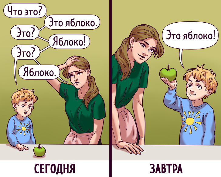 Повторення — найкращий спосіб запам'ятати, як слово використовується, і зрозуміти, змінюється його значення в залежності від часу або конкретної ситуації. Крім того, малюк тренує інтонацію і вимову.