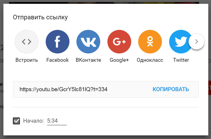 Якщо вам хочеться поділитися відео з друзями, причому щоб вони дивилися не весь ролик, а певний момент, зробити це можна за пару кліків. Для цього натисніть "поділитися", внизу поставте галочку "початок" і вкажіть бажаний час (у годинах, хвилинах, секундах). Також можна просто зупинити програвання відео в потрібний момент і натиснути "поділитися". Час буде вказано автоматично. Тільки не забудьте поставити галочку.