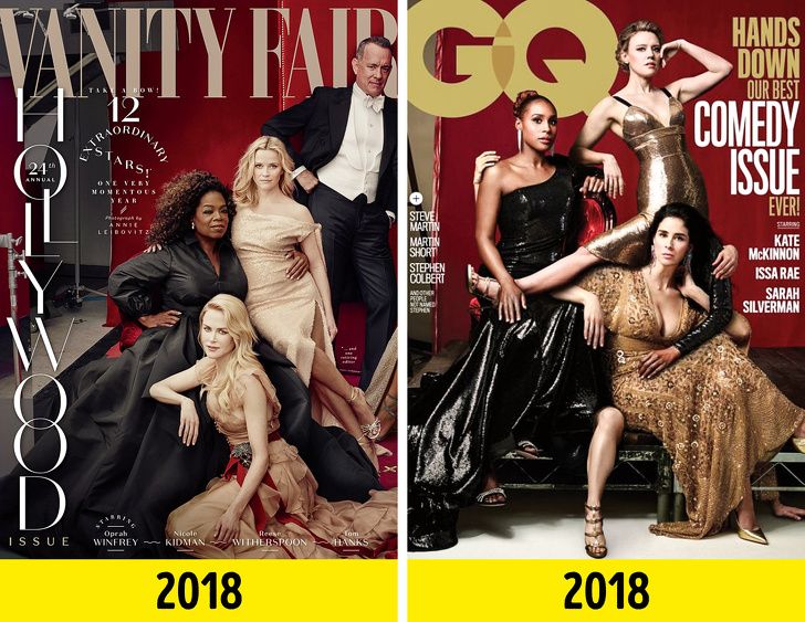 Обкладинка традиційного «голлівудського» номера Vanity Fair стала справжнім мемом цього року. Користувачі інтернету марно намагалися порахувати руки і ноги актрис. Спочатку всім здалося, що у Різ Уізерспун три ноги (із-за тіні від сукні), потім у Опри Вінфрі знайшлася третя рука. Здавалося б, на цьому кумедна історія могла б закінчитися, але через кілька місяців журнал GQ випустив пародійну обкладинку. Кажуть, головний редактор Vanity Fair Радхика Джонс дуже образилася на цей вчинок колег.