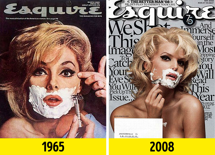 Оригінальна обкладинка журналу Esquire з нібито бреющейся моделлю вийшла в середині 60-х. Тоді темою номера стала маскулінізація жінок Америки. Забавно, але ця тема була зустрінута в багнети, тому позувати для обкладинки відмовилися Мерилін Монро і Кім Новак. У підсумку кадр був зроблений з італійською актрисою. Через 43 роки на честь свого 75-річчя Esquire вирішив перезняти скандальну обкладинку вже з Джесікою Сімпсон.