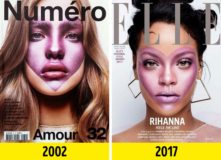 На початку нульових французький журнал Numéro помістив на обкладинку фото юної моделі Наталії Водянової з незвичним макіяжем на обличчі. Через 15 років той самий фотограф зробив знімок з Ріанною для журналу Elle. Тоді співачка розкручувала свою косметичну марку, і сердечко на її обличчі було намальовано стиком з нової лінійки продуктів.